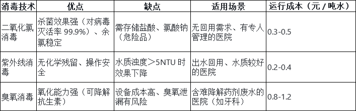 選型建議:多數(shù)小型醫(yī)院優(yōu)先選 “二氧化氯消毒”(性價比高),若有回用需求或水質(zhì)較清,選 “紫外線消毒”。