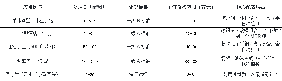 結(jié)合上述因素,我們整理了不同場(chǎng)景下設(shè)備的主流價(jià)格范圍(含設(shè)備本體、安裝調(diào)試,不含土建及管網(wǎng)),供采購(gòu)方初步預(yù)算參考:
